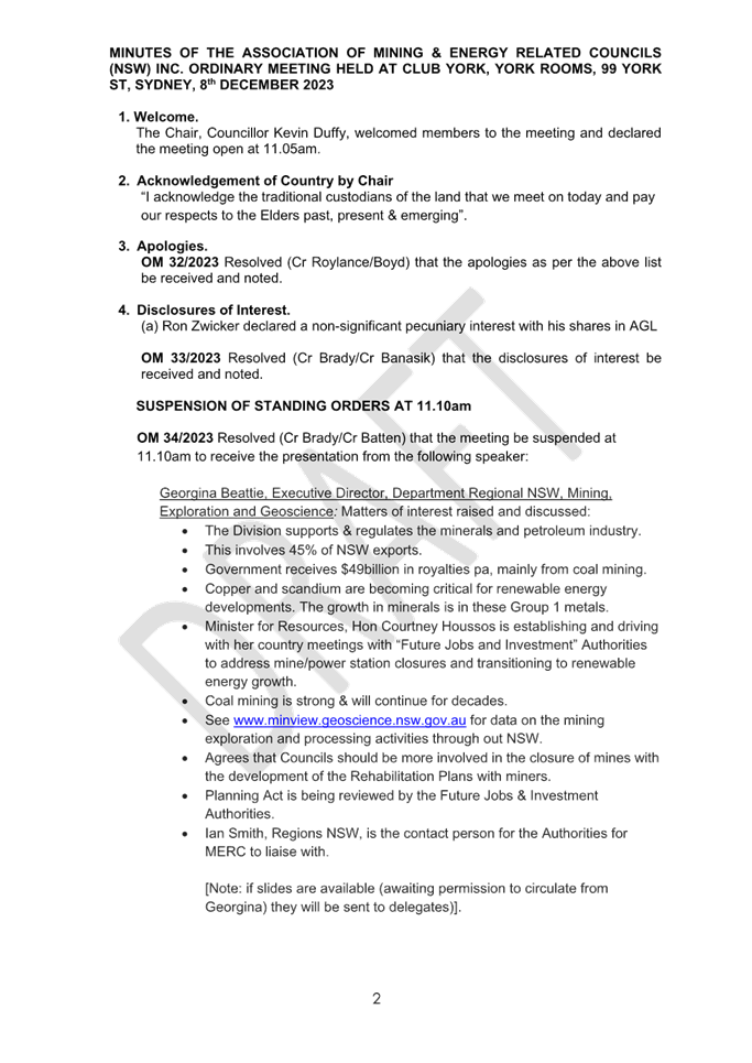 On 8 December 2023, Clr Batten and Deputy General Manager Cabonne Services, Heather Nicholls attended the Mining & Energy Related Committee meeting. The minutes of the December 2023 meeting of the Mining & Energy Related Councils meeting are attached for the information of the committee.