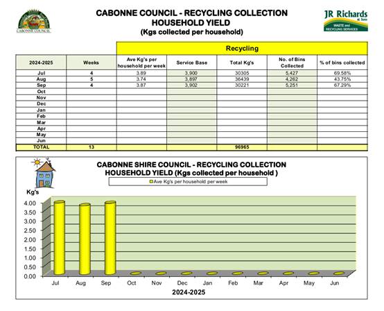 The following figures have been provided by council’s contractor JR Richards relating to the domestic waste service this current financial year.